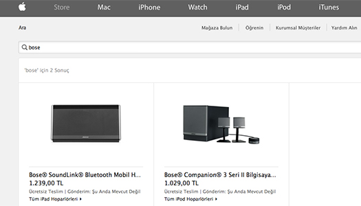 Bose ürünlerinin yeniden Apple Store’larda satışa sunulabileceğini dün sizlerle paylaşmıştık. iGen.fr isimli Fransız internet sitesi, Bose ürünlerinin tekrardan Apple Store’da satışa sunulacağını dile getirmiş, Apple’ın sipariş alımlarına önümüzdeki hafta başlayacağını belirtmişti. Cupertinolu şirket hızlı davrandı ve Bose ürünlerini yeniden Apple Store’larda satışa sundu. Amerika Apple Store Online’da Bose QuietComfort 20i, Bose SoundLink Mini ve Bose SoundLink III modelleri piyasaya sürülürken, Türkiye Apple Store Online’da Bose SoundLink II ve Bose Companion 3 Seri II hoparlörleri satışa sunuldu. Almanya ve İngiltere Apple Store Online’larda ise henüz Bose ürünleri satışta değil. Bose ürünlerinin Zorlu ve Akasya AVM’deki Apple Store’larda satışta olup olmadığı ise henüz belli değil.