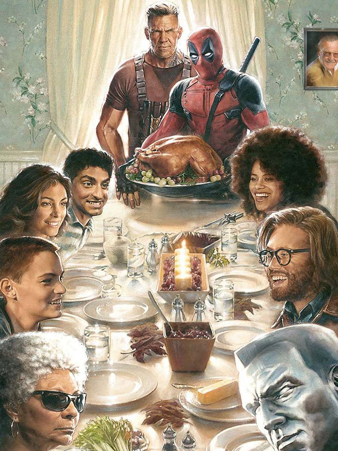 Deadpool 2 geçtiğimiz aylarda ortaya çıkan set fotoğraflarıyla bizleri fazlasıyla heyecanlandırdı. Buna rağmen hala filmin tam olarak neyi konu edeceğini bilmiyoruz. Net olan bir şey varsa o da Cable ve Domino’nun hikayede önemli bir yere sahip olacağı… Uzun süredir devam eden gizemli sürecin ardından Deadpool 2’nin ilk posterleri seyircilerle paylaştı. Bu posterde kahramanlarımızın Şükran Günü yemeği için bir araya geldiğini görüyoruz. Herkes masanın etrafına toplanmışken Deadpool da büyük bir hindinin servisini yapmaya hazırlanıyor. Hiçbir ipucu içermeyen bu posterin en fazla dikkat çekenleri ayakta duran Deadpool ve Cable oluyor. İkinci posterde ise kahramanımızı yemekteki marifetlerini sergilerken görüyoruz.