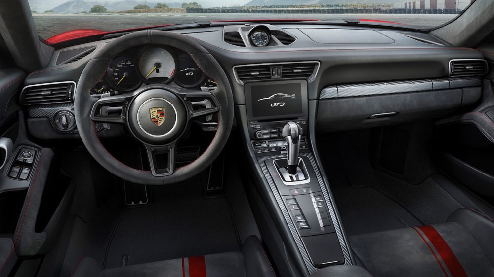İçerisinde de dışarıda sahip olduğu sportifliği sonuna kadar barındıran 911 GT3’te kullanılan spor direksiyon, markanın hibrit süper otomobili 918 Spyder’da kullanılan ile aynı. Geliştirilmiş yan yastıklar ve mekanik ileri/geri konum ayar özelliğine sahip Porsche Sports Seats Plus koltukları sayesinde sürücüyü ve yolcuyu özellikle virajlarda önemli oranda saran aracın koltuk yüksekliği ve sırtlıkları dijital olarak ayarlanabiliyor. Gerçek zamanlı trafik bilgileri sunan çevrimiçi navigasyon ve sürücülerinin sürüş bilgilerini akıllı telefonları üzerinden görüntüleme, kaydetme ve incelemelerine olanak sağlayan Track Precision sistemini standart olarak barındıran aracın kokpitinde son zamanlarda görmeye alışık olduğumuz bir tasarım bizleri karşılıyor.