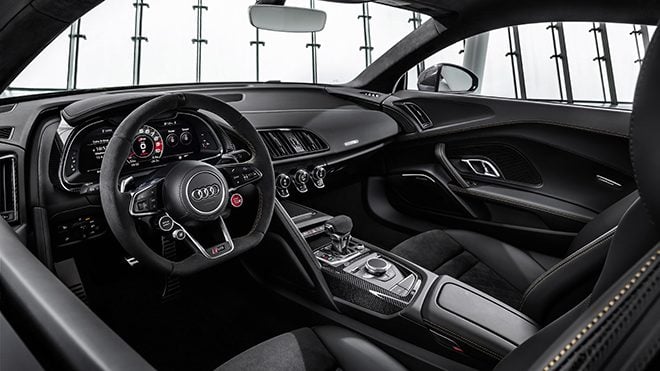 Audi R8 V10 Decennium’un iç tasarımında da siyah rengin üstünlüğü ve karbon fiber eklemeler bulunuyor. Özel sportif dikişli spor koltuklar, özel direksiyonu ve orta bölüm kol dayaması ve ön konsoldaki “Decennium” logosu özel bir otomobilin içinde olduğunuzu daha ilk anda fark etmenizi sağlıyor. Otomobilin kapılarında bulunan aydınlatma sistemi, Decennium logosunu ve otomobilin kısıtlı sayıda seri üretim numarasını zemine yansıtıyor. Diğer R8’lerde olduğu gibi bu otomobilde de Audi sanal kokpit ve MMI Navigation Plus standart olarak sunuluyor.