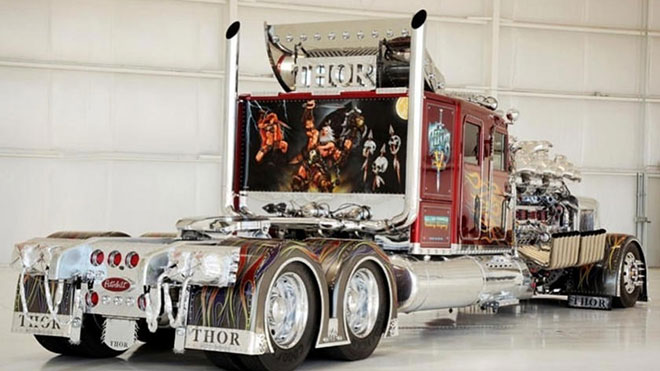 Thor 24, her halinden anlaşılabileceğiniz çok özel modifiye edilmiş bir kamyon modeli. Peterbilt 359 üstüne kurulan bu inanılmaz aracın arkasında Mike Harrah‘ın yer aldığı aktarılıyor. Her detayı ayrı özel bir paragrafı hakeden bu gerçekten sıra dışı çalışma, tam yedi yıllık bir emeğin sonucunda ortaya çıkmış. Suudi Arabistan’da yapılan bir açık artırmada tam 12 milyon dolara satılan “çılgın” kamyon, özellikle motor sistemiyle dikkatleri üzerine çekiyor. Görebileceğiniz üzere aracın önünde adeta bir gemi motoru gibi duran bir makine yer alıyor. Burada iki adet 12 silindirli Detroit dizel motorun 12 adet supercharger ile bir araya getirildiği aktarılıyor. İşte bu akıl almaz kombinasyonun 2.500 devirde tam 3,974 beygir güç ürettiği belirtiliyor. Saymadığımız sayıda alev püskürten egzoz çıkışına sahip olan Thor 24, saatte 210 km/s hıza çıkabiliyor deniyor.