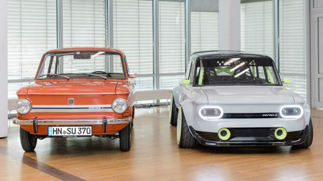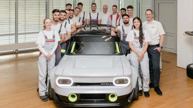 Audi’nin Neckarsulm tesisindeki çalışan 12 stajyer, Neckarsulm’da 1971’de üretilen bir NSU Prinz 4L‘i elektrikli olarak yeniden tasarladı, Audi EP4 doğdu.