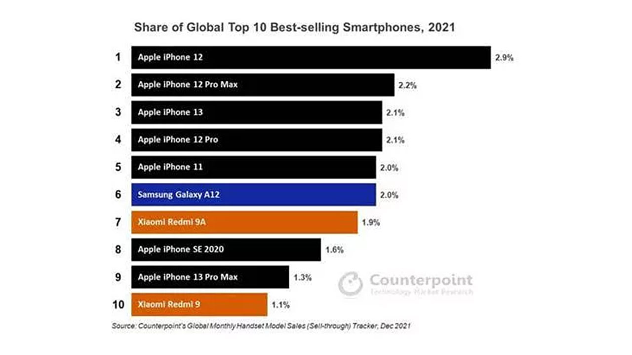 Counterpoint Research’ün 2021 yılında en çok satan akıllı telefon modelleri listesinin liderliğini Apple imzalı iPhone 12 aldı. İkinci sırada iPhone 12 Pro Max yer alırken, üçüncü sırada 2021’in sonunda gelen iPhone 13, dördüncü sırada iPhone 12 Pro, beşinci sırada ise iPhone 11 yer aldı. İlk beş sırayı kimseye kaptırmayan Apple, 2021’de iPhone’lar üzerinde bir kez daha inanılmaz yüksek gelir elde etti. Listenin altıncı sırasını orta alt seviye Samsung Galaxy A12 alırken, yedinci telefon Xiaomi Redmi 9A, sekizinci telefon iPhone SE 2020, dokuzuncu telefon iPhone 13 Pro Max ve son olarak onuncu telefon Xiaomi Redmi 9 oldu. İlk 10’a sadece Apple, Samsung ve Xiaomi girebildi, genel olarak lider ise Apple oldu.