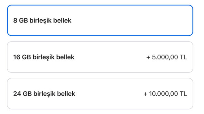 Bu konuda “Apple daha fazla RAM için satın alma opsiyonu sunuyor” diyebilirsiniz. Bundan haklısınız ancak Apple’ın RAM yükseltme seçenekleri yukarıda da görebileceğiniz üzere inanılmaz pahalı durumda. Türkiye’de 8 GB RAM’i 16 GB’a yükseltmek için tam 5 bin TL verilmesi gerekiyor. Apple 24 GB RAM içinse tam 10 bin TL fark istiyor. Apple, RAM yanında depolama artışlarında da çok yüksek fiyatlar talep ediyor.