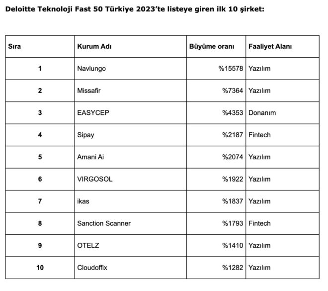 Bu konuda yapılan açıklama tam olarak şöyle oldu: “Deloitte Teknoloji Fast 50 Türkiye programının bu yılki kazananları açıklandı. Deloitte’un 1995 yılından bu yana dünya çapında yürüttüğü Deloitte Teknoloji Fast 50 programı Türkiye’de hızla büyüyen teknoloji şirketlerini belirliyor. Liste hazırlanırken şirketlerin son üç yıldaki net satış gelirlerindeki büyüme oranları değerlendiriliyor. Meta ve Trendyol iş birliği ile bu yıl 18’incisi düzenlenen ve 2020’den beri ilk kez canlı olarak gerçekleştirilen törenle kazananları açıklanan Deloitte Teknoloji Fast 50 programının bu yılki birincisi, son bir yılda yüzde 15 bin 578 büyüme gösteren Navlungo oldu. İkinci sırayı yüzde 7 bin 364 büyüme gösteren Missafir alırken Easycep yüzde 4 bin 353 büyüme oranına ulaşarak üçüncü oldu.”