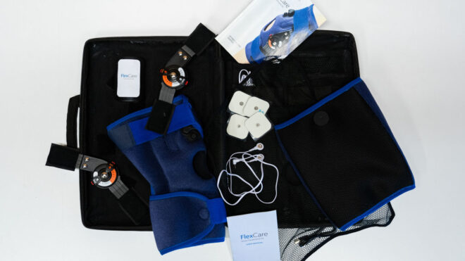 FlexCare Diz Tedavisi kiti üç ana tedaviyi entegre ediyor: stabilizasyon, kriyoterapi ve elektroterapi. Stabilizasyon bileşeni, sağlık uzmanları tarafından ayarlanan yerleşik bir mekanizma ve ROM (Eklem Hareket Açıklığı) menteşe sistemi aracılığıyla özelleştirilebilen, patella ve yan bağların etrafında şişirilebilir bir sisteme sahip bir destek içeriyor. Kriyoterapi için bir korse, üst kısım sıcaklığını korurken ciltle temas eden alanı soğutan bir Peltier sistemi barındırıyor. Kontrol cihazı sayesinde hasta tedaviyi başlatabiliyor.