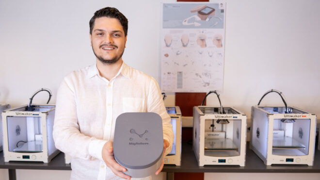 Günümüzde Migren ağrısı çeken insanlar, hayatlarına ve günlük aktivitelerine devam etmede zorluk yaşıyorlar ve ilaca çok fazla bağımlı kalıyorlar. İstanbul Bilgi Üniversitesi Endüstriyel Ürün Tasarımı mezunu Yusuf Sayın’ın icat ettiği MigRelieve, migren ağrısını doğal yollarla hafifletmek ve ilaç bağımlılığını azaltmak için tasarlanmış alternatif bir tıbbi üründür. “C” şekli, soğuk kompres, sıcak kompres ve ritmik titreşim terapisiyle trigeminal ve vagus sinirlerini hedeflerken baş üzerinde stabilite sağlıyor.
