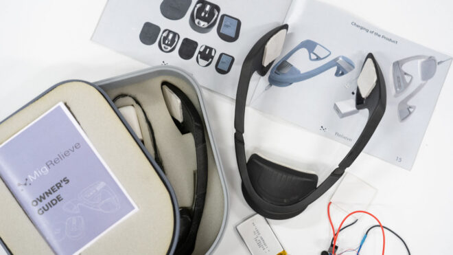 Trigeminal ve vagus sinirlerini hedef alan sıcak kompres, soğuk kompres ve titreşim terapisi sunuyor. MigRelieve, sıcaklık kontrolü için bir Peltier mekanizmasına ve ısı dağıtımı için alüminyum bir soğutucu ile mini bir titreşim motoruna sahiptir. Mikro denetleyici tabanlı bir platform tarafından çalıştırılıyor ve bir sıcaklık sensörü, lityum polimer pil, LED göstergeler ve termal pedler içeriyor. MigRelieve, migren ağrısını çok yönlü bir yaklaşımla yöneterek yaşam kalitesini artırmayı amaçlıyor.