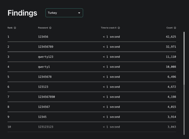 NordPass tarafından 2024 yılı için hazırlanan yeni rapor, 44 farklı ülkedeki en popüler 200 parolayı gözler önüne serdi. Aralarında Türkiye’nin de bulunduğu raporun genel sonucu, kullanıcıların parola konusunda bir türlü akıllanmadığını gösteriyor. Bunu diyoruz çünkü 44 ülkede en çok kullanılan üç parola halen, basit sistemlerle dahi kırılması sadece bir saniye süren “123456”, “qwery123” ve “123456789” oldu. Binlerce siber saldırı gerçekleşirken, çok sayıda güçlü parola oluşturma uygulaması varken ve iOS ile Android işletim sistemleri saniyeler içinde güçlü parolalar üretebilirken, 2024 yılında tüm uyarılara rağmen bu parolaların kullanılıyor olması gerçekten inanılmaz görünüyor. Listede yukarıda da görebileceğiniz üzere çok sayıda tanıdık parola yer alıyor. Bu konuda NordPass daha önce şunları aktarmıştı: “Araştırmamız sonrasında siber güvenlik bilincinin artmasına rağmen eski alışkanlıkların kolay kolay ölmediğini öğrendik. Araştırma, insanların hesaplarını korumak için hala zayıf şifreler kullandığını gösteriyor.”