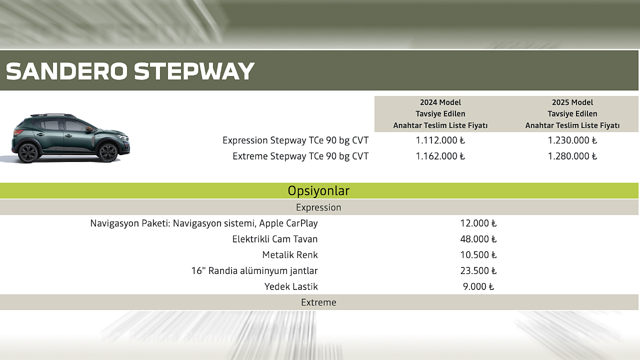 Dacia Sandero Stepway’in 2025 model yılı için listelenen başlangıç fiyatı 1 milyon 230 bin TL oldu. Bu fiyat, aracın Expression Stepway TCe 90 bg CVT versiyonu için geçerli. Modelin Extreme Stepway TCe 90 bg CVT versiyonu ise, 2025 model yılı özelinde 1 milyon 280 bin TL‘ye satın alınabiliyor. Aracın 2024 model yılı fiyatları ise sırasıyla 1 milyon 112 bin TL ve 1 milyon 162 bin TL seviyesinde bulunuyor. Dacia’nın Türkiye’de sattığı diğer modeli olan Jogger’ın 2025 model yılına ait başlangıç fiyatı ise 1 milyon 452 bin TL’den (Extreme Turbo ECO-G 100 bg, 5 koltuklu) başlıyor.
