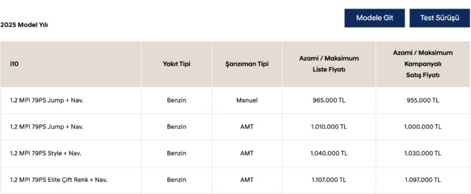 Hyundai Türkiye, fiyat listelerini 2025 için güncelleyen ilk üreticilerden oldu. Bazı araçlarında ufak artışlar gerçekleştiren şirket, otomatik vitesli “2025” model i10 1.2 MPI 79PS Jump + Nav için 1 milyon TL fiyat listeledi. Artık yeni bir otomatik vitesli Hyundai otomobil sahibi olmak isteyenlerin en az 1 milyon TL’yi gözden çıkarması gerekiyor. Manuel vitesli 2025 model i10 1.2 MPI 79PS Jump + Nav içinse 955 bin TL fiyat etiketi listeleniyor. Otomatik vitesli “2024” model i10 1.2 MPI 79PS Jump + Nav için listelenen fiyat ise 4 Ocak itibarıyla 970 bin TL seviyesinde yer alıyor.