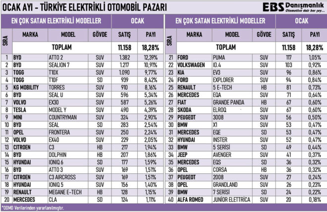 Otomobil gazetecisi Emre Özpeynirci tarafından yapılan paylaşıma göre, 2026’nın ocak ayında en çok satılan sıfır elektrikli otomobil modelleri şunlar oldu: