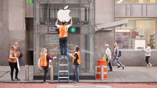 New York 5. Cadde’deki ikonik cam küp tasarımlı Apple mağazası bir süredir bakımda. Bunu fırsat bilen bir ekip, oldukça etkileyici bir şakaya imza atıyor.
