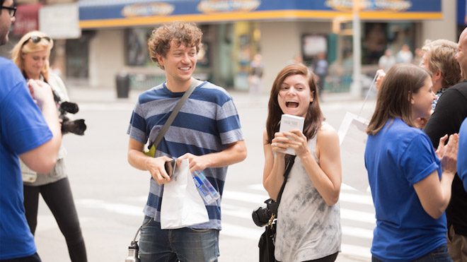 5. Cadde’deki ikonik cam küp şu an pek ulaşılabilir durumda değil. Bunun yerine mağazayı cam küpün hemen arkasındaki binaya taşıyan Apple, 5. Cadde’deki küpün üstünü de örtmüş durumda. Haliyle New York sokaklarına başka bir cam küp tasarımlı Apple mağazası gerek! Tam olarak böyle düşünen bir ekip, eğlenceli bir şakanın hazırlıklarına başlamış. New York’taki metro asansörlerinin de saydam plakalardan oluşması ekibe oldukça kolaylık sağlıyor. Dev bir logo bastıran ekip, 23. Cadde’deki metro asansörüne logoyu yerleştiriyor ve ekibin bir kısmına mavi, logolu tshirtler giydiriyor. Yeni açılan mağazanın duyurusunu yapan ekibe sıra oluşturan arkadaşları eşlik ediyor. Sanki gerçek bir açılış varmış ve insanlar sıraya girmiş izlenimi veriyor.