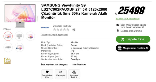 Samsung ViewFinity S9 (LS27C902PAUXUF) için ilk olarak burada (Mediamarkt Türkiye) başlayan Türkiye satışı, 25.499 TL gibi beklentilerin çok ama çok daha altında bir fiyatla oldu. Bunu diyoruz çünkü modelin yurt dışı fiyatı 1.600 dolar seviyesinde yer alıyor, sadece kur çarpımı 42 bin TL yapıyor. Mediamarkt’ın ürünün fiyatında bir yanlışlık yapma ihtimali bulunuyor ancak Vatan Bilgisayar da stok olmamasına rağmen aynı monitörünü burada sadece 23.799 TL’den listeliyor. Türkiye fiyatı bu açıdan henüz yüzde 100 kesin olmayan model, üzerinden geçmek adına rakibi Studio Display’den farklı olarak 27 inç boyutundaki 5K panelinde (218 PPI) “mat” kaplama kullanıyor. Yani istense de parlak olarak satın alınamayan ürün, hem Windows hem de Mac bilgisayarlar ile uyumlu tasarlanmış. İnce çerçeveleriyle dikkat çeken metal gövdeli üst seviye monitör, rakibi gibi maksimum 60 Hz yenileme hızı sunuyor. Apple Studio Display’den farklı olarak yerleşik bacak ünitesi ile “pivot” yani dikey modda kullanım desteği bulunan yüzde 99 DCI-P3 kapsamalı ViewFinity S9, akıllı telefonlar üzerinden kalibre edilebiliyor. Bu akıllı kalibrasyon altyapısı ile tasarımcılar ve fotoğrafçıları çok memnun edecek monitör, DisplayPort ile Thunderbolt 4 portlarını da beraberinde getiriyor. Bünyesinde çıkarılabilir yapıda bir 4K webcam eklenen 5K monitör, kablosuz Apple AirPlay desteği ile Mac’lerin görüntüsünü rahatlıkla üzerine alabiliyor. VESA desteği de olan ViewFinity S9, Samsung’un resmi verilerine göre 600 cd parlaklık ve 1000:1 kontrast oranına sahip. Oyun amacı olmadığından tepki süresi 5 ms olan ürün, kavisli değil düz yapıyı benimsiyor.