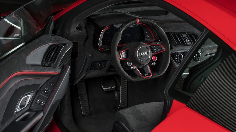 ABT ekibinin R8 üzerinde yaptığı tasarımsal ve aerodinamik parçalar baktığımızda ilk olarak gözümüze ön tampondaki küçük tasarım değişiklikleri ve karbon parçaların çok daha hakim olarak kullanışı çarpıyor. Aynalar, tamamen yeni paslanmaz çelikten egzozlar ve ön tampondaki çıtada karbon fiber parçaları kullanan ekip geliştirme paketinin jant ayağında 19 ve 20 inç büyüklüğündeki yüksek performans seçeneklerine yer veriyor. ABT dokunuşlarını daha detaylı olarak görmek için aracın içerisine girmemiz yeterli aslında. Bu segmentteki otomobilleri çok daha etkileyici kılan “detay” faktörleri üzerinde yapılan deri, karbon ve mat kaplama özel kokpit gibi geliştirmeler dışarıdaki performans arzusunun içeride kullanıcıyla bütünleşmesini sağlıyor.