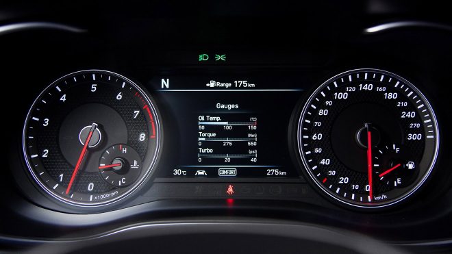 Genesis G70’in dış bölümündeki dikkat çeken tasarımını içeride devam ettirdiğini de söylemek isterdik lakin bu, kendisine rakip olarak seçtiği markalara oranla pek mümkün değil. Standart versiyonlarında boyutu 8 inç olan MirrorLink, Apple CarPlay ve Android Auto destekli multimedya ekranla gelen araçta Lexicon ses sistemine yer verilmiş. Direksiyon arkasındaki sürücü ekranıyla geleneksel hatları koruyan G70’in, Audi, Mercedes ve BMW’nin kokpit yapılarına oranla bir adım geriden geldiğini görebiliyoruz. Elektronik destek üniteleriyle günümüzün ve sınıfının ihtiyaçlarını karşılayan araçta çarpışma önleme asistanı, otoban sürüş asistanı, kör nokta uyarı sistemi, sürücü yorgunluk algılama ve uyarı gibi ekipmanlar yer alıyor ki Genesis tüm bu ekipmanlarla birlikte aracının çarpışma önlemede en yüksek skoru elde edebileceğinden fazlasıyla emin.