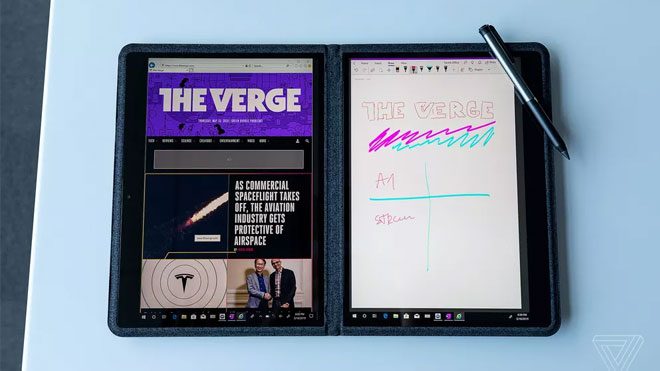 Kalem desteğinin de unutulmadığı panellerin yanı sıra Intel ayrı bir aksesuar olarak, hayli ince bir klavye de tanıtmış. Bluetooth bağlantısıyla cihaza bağlanan klavye, kitap ayracı gibi iki panel arasına yerleştiriliyor. Çift ekranlı cihazın gövdesinde herhangi bir dahili klavye mevcut değil. Söz konusu çift ekranlı sistemin her iki tarafında da 60 WHr‘a kadar pil bulunduğu belirtilirken tüm sistemin yaklaşık 770 gram ağırlığında olduğu da açıklamalar arasında.