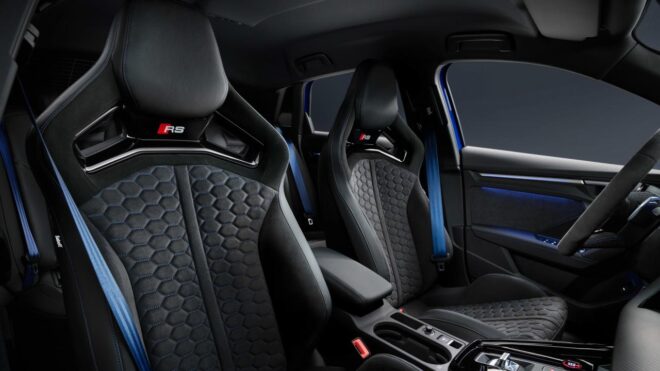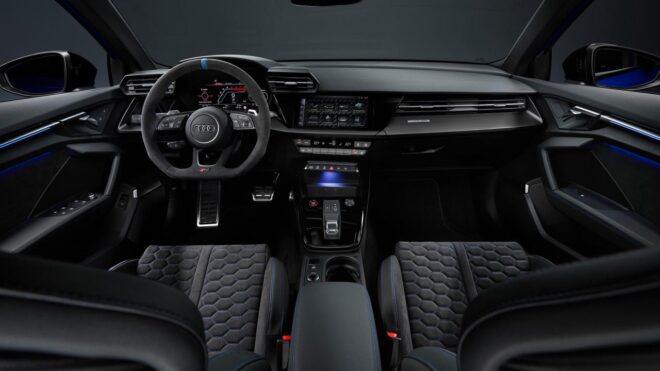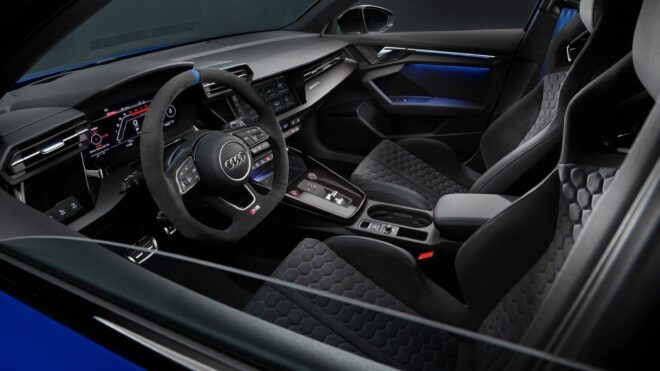 Özel model, ayrıcalığını iç mekanda da gösteriyor. RS 3’te ilk kez, standart donanım olarak sunulan koltuklar, dinamik viraj alma sırasında yanal destek sağlıyor. Koltuklar kontrast oluşturan mavi petek dikişlere sahip. Özel modelde, 10.1 inç dokunmatik ekrandaki arka plan görüntüsü karbon görünümlü ve karakteristik 2.5 TFSI 1-2-4-5-3 ateşleme sırasını gösteriyor. RS monitörü ayrıca soğutma suyu sıcaklığı, motor ve şanzıman yağı, g-kuvvetleri ve lastik basınçlarının görüntülerini de içeriyor. Aynı zamanda, Audi sanal kokpit plus tur süreleri, g-kuvvetleri ve 0-100 km/s, 0-200 km/s hızlanma gibi performansla ilgili veriler de bulunuyor. Fiyatları henüz açıklanmayan model için beklenti 85.000-90.000 euro aralığında.