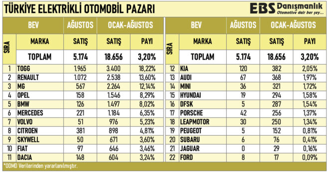 Yapılan hesaplamalara göre ağustos ayında Türkiye’de en çok elektrikli otomobil satan marka yerli Togg oldu. Markanın tek modeli T10X, toplam 5.174 elektriklinin satıldığı ağustos ayında 1.915 satış rakamına ulaştı. Burada gerçek liderin halen Tesla olduğu düşünülüyor ancak firma Otomotiv Distribütörleri ve Mobilite Derneği (ODMD) kaydı olmadığı için resmi veri paylaşmıyor. Tesla’nın Türkiye’ye getirdiği tek araç olan Model Y’nin satışı hakkındaki detaylar buradaki haberimizde yer alırken, liderlikte Togg’u ağustos ayında sattığı 1.072 elektrikli ile Renault, 567 araç ile MG, 381 araç ile Citroen, 221 araç ile Mercedes-Benz, 158 araç ile Opel, 148 araç ile Dacia, 126 araç ile BMW, 120 araç ile KIA ve 97 araç ile Fiat gibi markalar izliyor. Türkiye’de ağustos ayında en çok satılan sıfır otomobil modeli ise Renault Megane Sedan oldu. İkinci sırada karşımıza Renault Clio HB çıkıyor, üçüncü sırada Chery TIGGO 8 Pro bulunuyor. Listenin devamında ise sırasıyla Chery OMODA 5, Togg T10X, Fiat Egea Sedan, Chery TIGGO 7 Pro, Hyundai Bayon, Volkswagen T-Roc, Daica Duster, Fiat Egea Cross, Opel Corsa, Volkswagen Polo, Renault Austral, Toyota Corolla, Hyundai Tucson, Opel Crossland, Ford Focus, Peugeot 2008, elektrikli Renault Megane E-Tech ve Opel Mokka gibi modeller sıralanıyor.