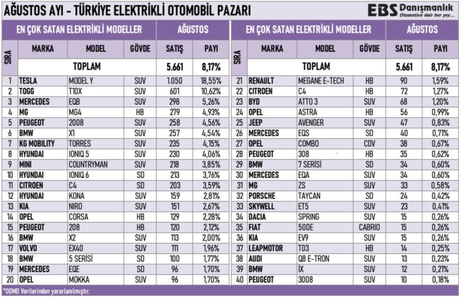 Otomotiv Distribütörleri ve Mobilite Derneği verileri üzerinden ağustos ayında Türkiye’de en çok satılan sıfır elektrikli otomobiller listelendi.