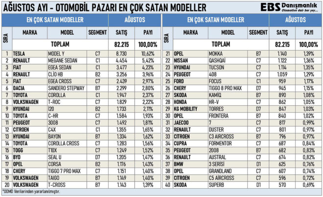Otomotiv Distribütörleri ve Mobilite Derneği verileri üzerinden ağustos ayında Türkiye’de en çok satılan sıfır otomobil modelleri listelendi.