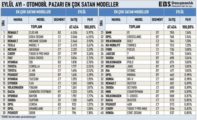 Emre Özpeynirci tarafından burada yapılan paylaşıma göre eylül ayında Türkiye’de en çok satılan sıfır otomobil modeli, 4.026 adetlik satışla Renault Clio oldu. İkinci sırada karşımıza 3.066 adetlik satışa ulaşan Fiat Egea Sedan çıkıyor, üçüncü sırada ise 2.646 adetlik satışa ulaşan Renault Megan bulunuyor. Eylül ayında 2.200 adet Togg T10x satıldı. Satış konusunda eylül ayının ilk 10 modeli tam olarak şöyle sıralanıyor: