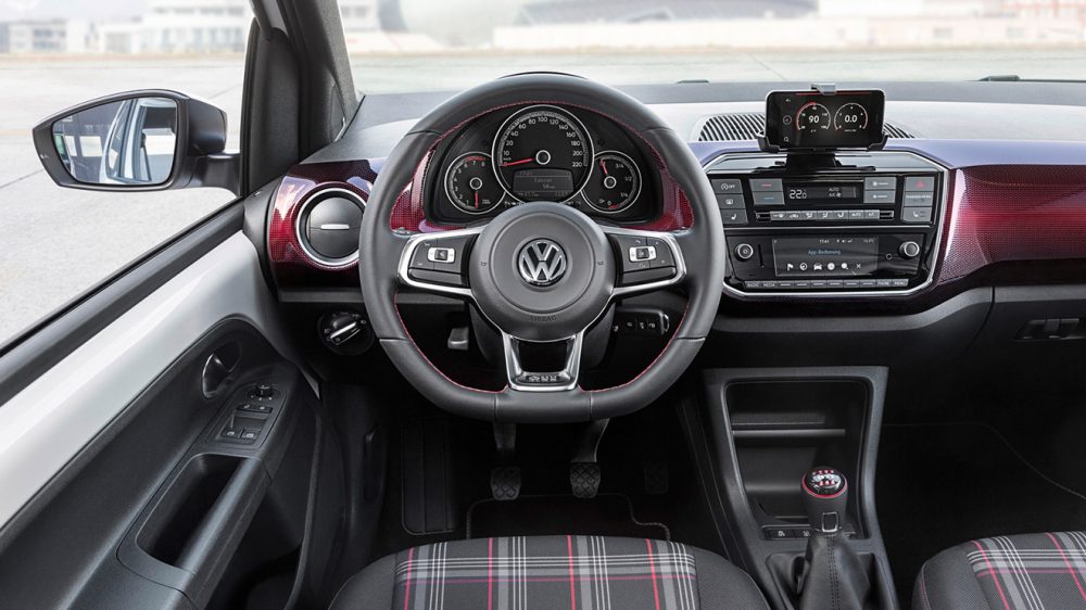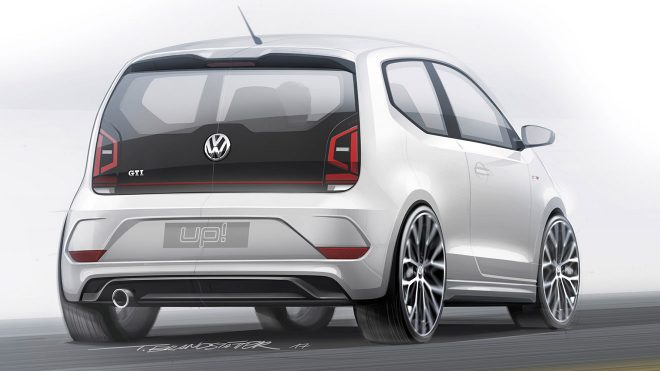 Tasarım bazında büyük oranda standart versiyonla benzerlerlikleri barındıran up! GTI‘da Volkswagen ailesinin diğer modellerinde gördüğümüz GTI değişikliklerini görmek mümkün. Golf başta olmak üzere birinci jenerasyon GTI modellerinden itibaren bir ikon haline dönüşmüş kırmızı çizgili ön ızgaranın izlerini gördüğümüz araçta siyah fontun kullanıldığı ön tampon, marşpiyeller, spoyler, difüzör, tampon ve 17 inç büyüklüğündeki jantlar dış tasarımda bütünsel değişimi tamamlıyor. Aracın içerisine girdiğimizde de yine diğer GTI modellerinden tanıdığımız dokuşlar göze çarpıyor. Kırmızı renk ağırlıklı kokpit, vites topuzu ve GTI deri direksiyon içeride sizi sportif bir araçta hissettiren detaylar arasında.