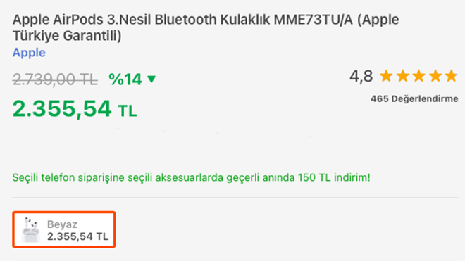 AirPods 3 için yapılan indirimle kablosuz kulaklık 2.355 TL’ye satılıyor. Kulaklık bir satış kanalında bu fiyata satılırken kablosuz kulaklık Apple’ın mağazasında 2.599 TL’ye satılıyor. MagSafe desteğiyle gelen model bu sayede bu teknolojiye destek veren cihazlarla kablosuz şarj edilebiliyor. AirPods Pro’da ANC özelliği bulunurken bu modelde bu özellik sunulmuyor.