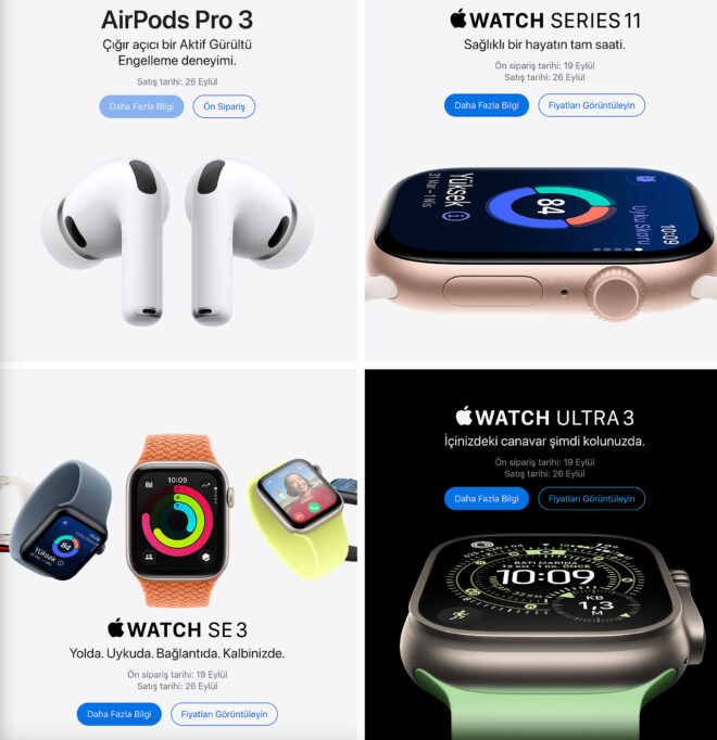 Apple Watch SE 3’ün Türkiye başlangıç fiyatı 13.999 TL, Watch Series 11’in Türkiye başlangıç fiyatı 21.999 TL, Watch Ultra 3’ün Türkiye başlangıç fiyatı ise tam 59.999 TL seviyesinde yer alıyor. AirPods Pro 3 ise 13.999 TL fiyatla satılıyor. AirPods Pro 3 hakkında Apple’ın açıklaması şöyle: “İnanılmaz bir ses kalitesi sunan AirPods Pro 3, çığır açıcı Aktif Gürültü Engelleme deneyimiyle gürültüleri önceki nesil AirPods Pro ile karşılaştırıldığında 2 kata, ilk nesil AirPods Pro ile karşılaştırıldığında 4 kata kadar daha fazla engelliyor. AirPods Pro 3, yenilenen tasarımı sayesinde kulağa daha da iyi uyuyor ve koşu, yüksek yoğunluklu antrenman, yoga gibi aktiviteler sırasında daha fazla hareket özgürlüğü sunuyor. Kullanıcılar ilk defa AirPods Pro 3 ile kalp atış hızını ölçebiliyor ve iPhone’daki Fitness uygulamasının yeni deneyiminde 50’den fazla antrenman türünü takip edebiliyor. Bu modelle birlikte AirPods’a eklenen Canlı Çeviri özelliği ise aynı dili konuşmayan kişilerin iletişim kurmasına yardımcı olarak yüz yüze konuşmaları daha kolay hale getiriyor.”