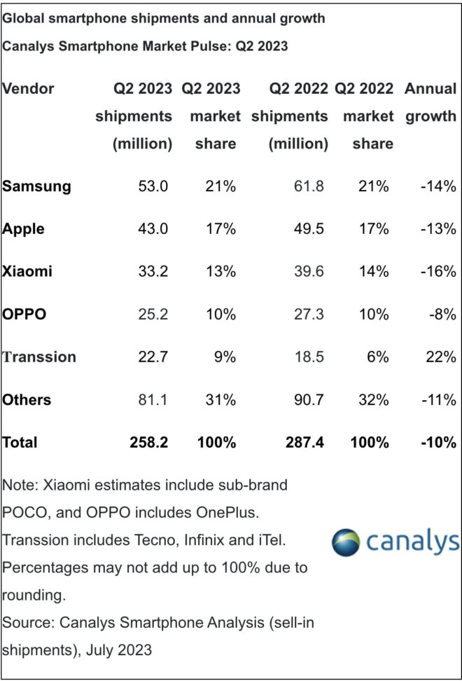 Akıllı telefon sektöründeki son durum paylaşılan Q2 2023 raporu ile beraber ortaya döküldü. Sektör lideri yine Samsung.