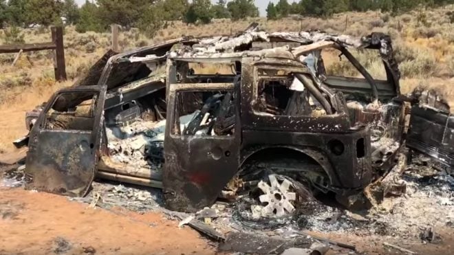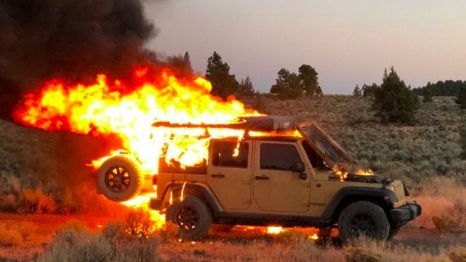 Issız bir çölde bir anda alev topuna dönen Jeep Wrangler, sahibi tarafından baştan sona video kaydına alındı.
