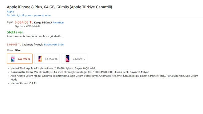 Apple mağazasında iPhone 8 Plus modeli 7.499 TL’den başlayan fiyatlarla satılıyor. Amazon’da yer alan 64 GB iPhone 8 Plus modeli ise Gümüş rengi 5.034 TL‘ye Uzay Grisi modeli 5.509 TL‘ye, Altın modeli ise 5.614 TL‘ye satılıyor. Stokların hayli kısıtlı olduğunu da ekleyelim. Yine Amazon tarafından satışta olan iPhone SE 32 GB 2.120 TL‘ye alınabilirken, 32 GB iPhone 7 fiyatları ise 3.704 TL‘den başlıyor.