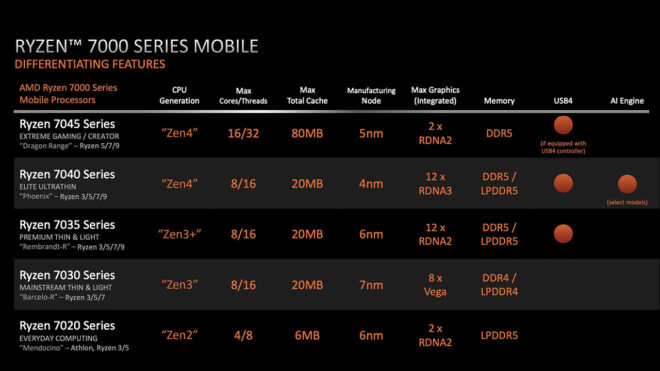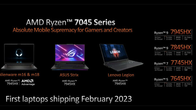 AMD CES 2023’te aynı zamanda ilginç olarak Zen 4, Zen 3 Plus, Zen 3, ve Zen 2 mimarilerinin hepsini kullanan dizüstülere özel Ryzen 7000 işlemcilerini de tanıtıldı. Hepsini aşağıdaki görsellerde görebileceğiniz mobil işlemcilerin en güçlüsü Zen 4 Ryzen 9 7945HX oluyor. Bu 16 çekirdekli işlemci, en üst seviye oyuncu ve iş odaklı dizüstülere odaklanıyor.
