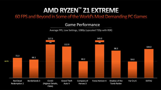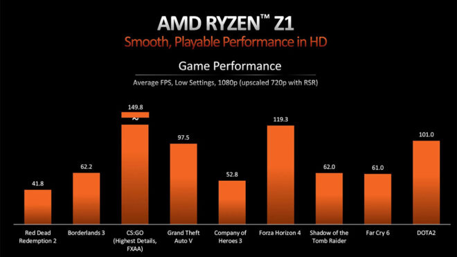 AMD, 4nm üretim sürecinden çıkan Ryzen Z1 ve Z1 Extreme işlemcileri ile daha önce yapılan sızıntılar nedeniyle çok da sürpriz olmayan bir çıkış gerçekleştirdi. Firmanın resmi verilerine göre GPU entegre Ryzen Z1, 6 çekirdekli bir işlemci, 4 farklı RDNA 3 grafik çekirdeği taşıyor ve 2.8 TFLOPS grafik gücü ortaya koyuyor. Performans konusunda büyük fark bulunan yine GPU entegre Ryzen Z1 Extreme ise 12 çekirdekli bir işlemci, 12 farklı RDNA 3 grafik çekirdeği taşıyor ve toplam 8.6 TFLOPS grafik gücü ortaya koyuyor. En üstte 30W güç çekebilen Ryzen Z1 Extreme, AMD’nin paylaşımına göre taşınabilir oyun cihazlarında Red Dead Redemption 2 gibi bir oyunu, 720P’den RSR ile 1080P’ye yükseltilmiş şekilde ve en düşük ayarlarda 70 FPS’in üstünde oynatabilecek. Bu işlemcinin GTA5 oyununda 112 FPS’i, Forza Horizon 4‘te ise 143 fps’i görebileceği aktarılıyor. Altta yer alan normal Ryzen Z1 işlemci ise hemen aşağıda görebileceğiniz birçok oyun testinde 60 fps akıcılık seviyesini yakalayabiliyor, bazısında geçebiliyor.