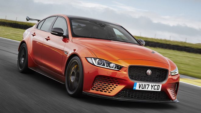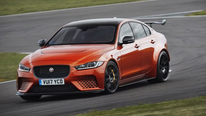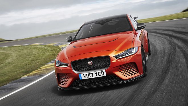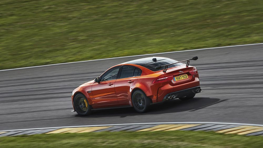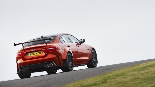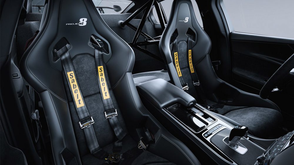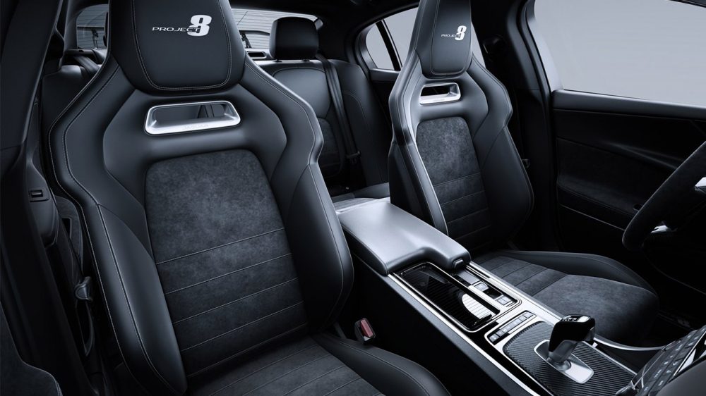 Tamponlar ve kaput olmak üzere ağırlığa büyük değişim sağlayan bölümleri tamamen karbon fiberden olan XE SV Project 8’in aerodinamik açıdan daha iyi hale getirilmesi adına ayarlanabilir ön lip, difüzör ve yine ayarlanabilir yapıda arka kanat kusursuz bir ahenk içerisinde görev yapıyor. Üzerinde 20 inçlik alüminyum jantlarla birlikte gelen aracı erişebildiği saatte 321 kilometrelik hızlarda güvenli bir şekilde durdurabilmek içinse karbon seramik frenlerden yardım alınıyor. Kokpitinde bizleri Alcantara kaplı bir direksiyon ile karşılayan aracı, sunulan Track Pack (Pist paketi) ile roll cage ve karbon fiber yarış koltuklarıyla almak mümkün.