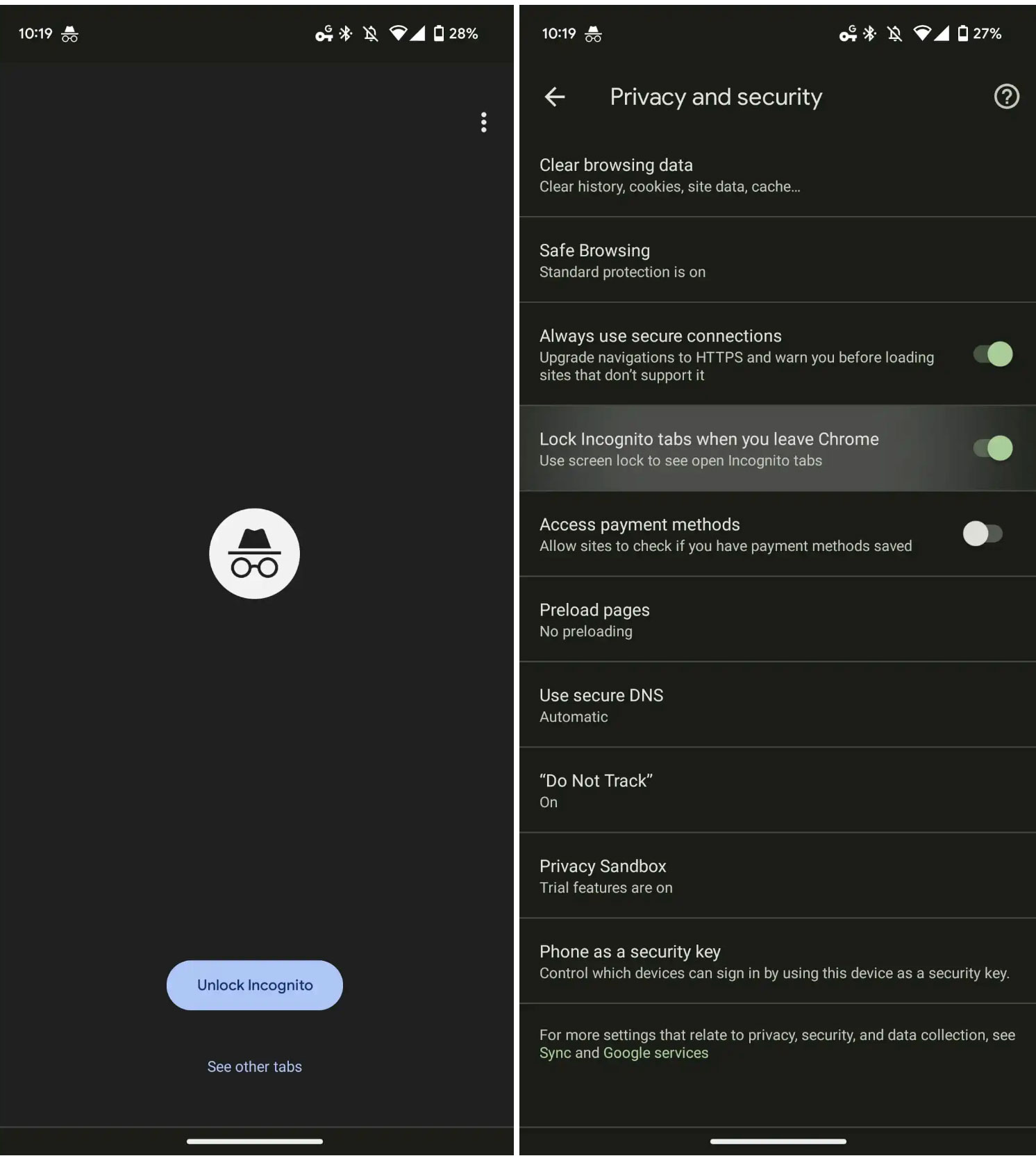 Android için Chrome tarayıcıda isterseniz gizli sekmeleri parmak iziniz ile koruma altına alabiliyorsunuz. Bunun için adres çubuğuna yapıştırıp giriş yaptığınız “chrome://flags/#incognito-reauthentication-for-android” bağlantısı üzerinden özelliğin açılması gerekiyor. Bu özellik açıldıktan sonra Chrome’un kendi gizlilik ve güvenlik ayarlarına “Chrome’dan ayrıldığınızda Gizli sekmeleri kilitleyin” seçeneği geliyor.