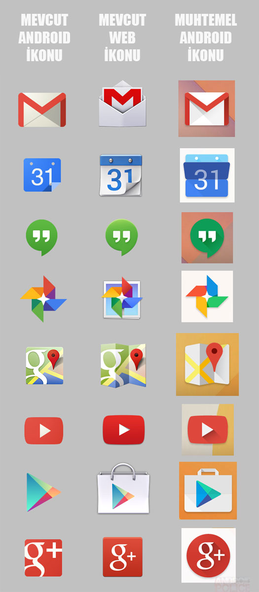Şirket içinde “Moonshine” olarak anılan yeni ikon tasarımı, temelde mobil uygulamaların ikonlarını ilgili servislerin web ikonlarına yaklaştırıyor. Halihazırda web ve mobil uygulamalarda kullanılan Google ürünlerine ait logolar az da olsa farklılık gösteriyor.