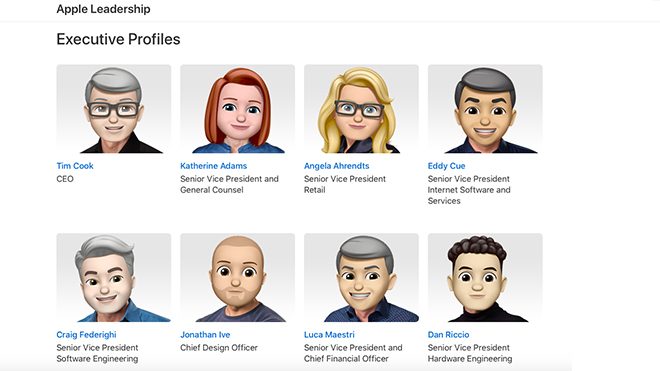 Apple bununla birlikte internet sayfasında bir sürpriz yaptı ve Apple liderlik ekibinin fotoğraflarını Memoji’lerle değiştirdi. Bu sayfaya tıkladığınızda tüm Apple yönetiminin fotoğraflarını Memoji’lerle değiştirdiğini göreceksiniz.