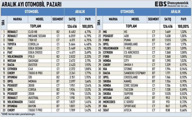Otomotiv Distribütörleri ve Mobilite Derneği verileri üzerinden aralık ayında Türkiye’de en çok satılan sıfır otomobil modelleri listelendi.