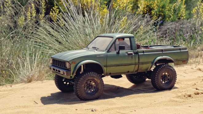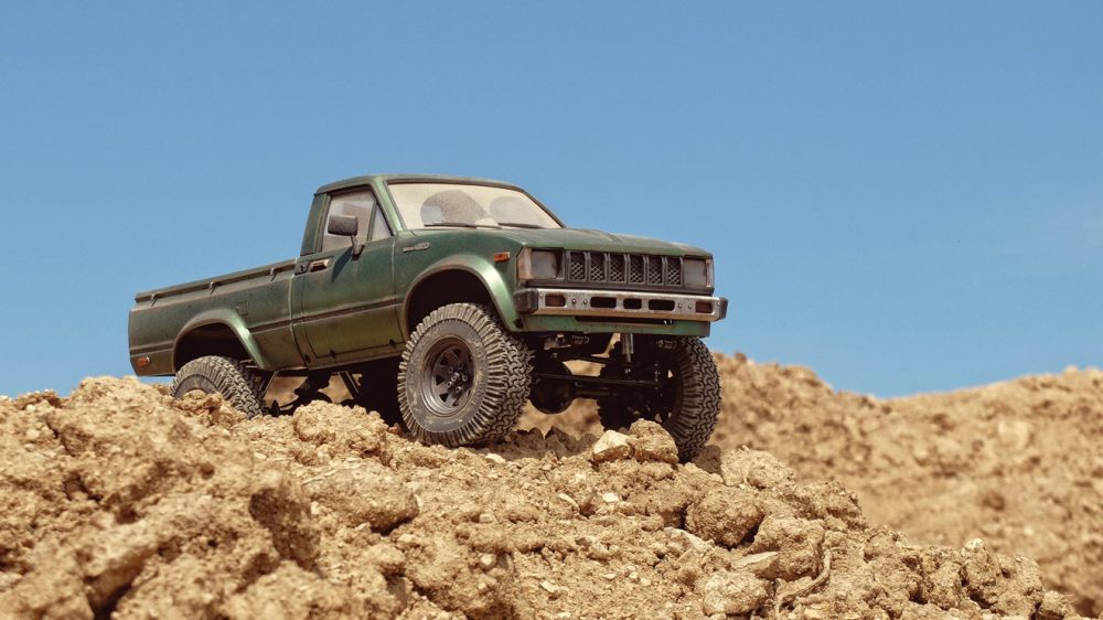 Çıkış noktası, hobiciler arasında süregelen bir tartışma konusu olsa da, piyasaya çıkan ilk “gerçekçi” R/C arazi aracı modeli, modelciliğin efsane markası Tamiya’nın Bruiser modeliydi. Kumandadan kontrol edilen 3 vitesi, metal dingilleri, yaprak yaylı süspansiyon sistemi ve sert plastikten gövdesi olan bir Toyota Hilux Pickup modeliydi. Tamiya, bu modeli 1985 yılında piyasaya çıkarmıştı ancak yeniden üretilen serisini bugün bile satın almak mümkün. Her ne kadar kozmetik unsurları ve lastik/jant seçimiyle tam olarak gerçekçi görünmese de, hobinin tohumları atılmaya başlanmıştı.