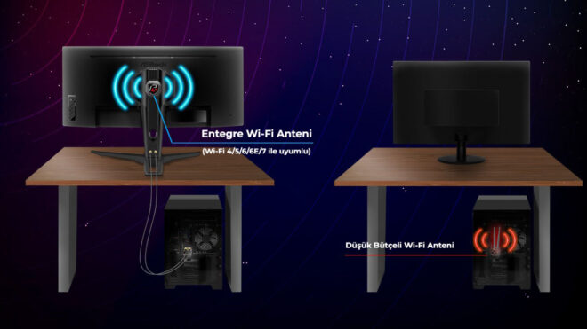 PG27QFT2A ve PG27QFT1B modeli monitörler QHD çözünürlüğü sayesinde olağanüstü netliğe ve detaylara sahip görüntüler sunabiliyor. Her iki model de VESA DisplayHDR 400 sertifikasına sahip görüntü teknolojisini barındırıyor. Bu sayede hayatın renklerini en canlı hali ve en gerçekçi görüntülerle kullanıcılara sunuyor. Phantom Gaming, monitörlerin ayağında zekice yerleştirilmiş özelliklere sahiptir. PG27QFT2A modelinde, bir önceki nesil olan Wi-Fi 6E’den %480 daha hızlı olan en yeni Wi-Fi 7 teknolojisini destekleyen özel ve dahili bir Wi-Fi anteni yer alıyor. Basit bir şekilde anten bilgisayara bağlanıyor, böylece bilgisayarın sinyal kalitesini düşürecek dağınıklığından sıyrılarak Wi-Fi antenini masanın üstüne taşıyor. 7dBi kazanıma kadar çıkabilen anteni, çok daha hızlı ve stabil bir sinyal bağlantısını sunabiliyor. Bu sayede oyuncuların akıcı ve gecikmesiz bir oyun deneyimi almasının yanı sıra, herkes için en stabil bağlantı performansı edinmesini sağlıyor.”