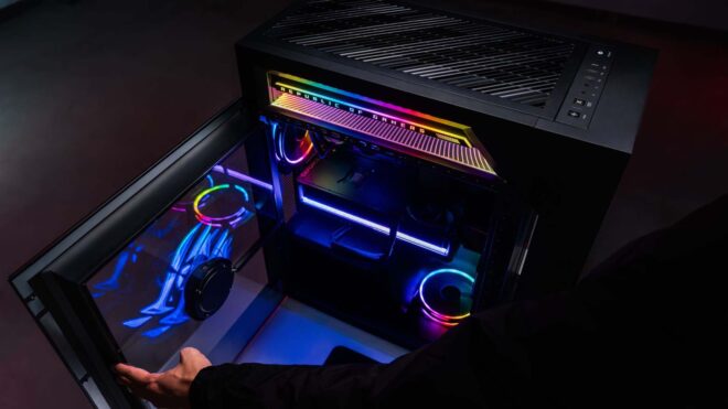 Asus, CES 2026 Fuarı’nda hologram sistemiyle donattığı ROG G1000’i tanıttı. En üst seviyede AMD Ryzen 9 9950X3D işlemci, ROG Astral GeForce RTX 5090 ekran kartı ve 128 GB DDR5 RAM ile donatılabilecek ROG G1000’in fark yarattığı nokta, taşıdı fan tabanlı hologram sistemi oldu. Kasanın önünde 384 LED içeren iki adet 215 mm’lik, yan tarafında ise 680 LED içeren 380 mm’lik fan bulunuyor. Bu fanlar döndüğünde MP4, PNG, JPG ve GIF dosyaları kullanılarak yüklenen grafikleri gösteriyor. Hologram fanlarını kasanın hava akışını bozmayacak şekilde tasarladıklarını aktaran şirket, bu altyapıya “AniMe Holo” adını veriyor. 420mm’lik radyatöre temiz havayı kasanın içinden değil ayrı bir bölümden çeken 107 litrelik dev kasanın satış fiyatı henüz açıklanmış değil.
