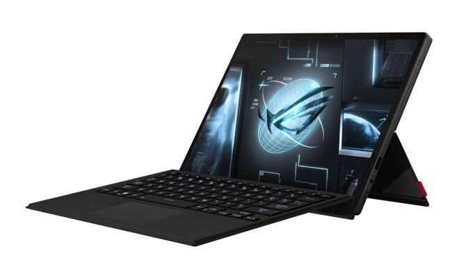 Henüz fiyatları açıklanmayan monitörlere ek olarak ROG Flow Z13 de CES 2022’de duyurulanlar arasındaydı. Daha önce müjdesi verilen ürün, hibrit yapıda bir dizüstü ve tablet olarak da kullanılabiliyor. Tablet formunda dünyanın en güçlü oyuncu tableti olarak aktarılan çünkü gücünü RTX 3050 Ti ekran kartından alan ürün, 13,4 inç 1080P 120 Hz dokunmatik ekran üzerine kuruluyor ve işlemci tarafında Intel Core i9-12900H kullanıyor.