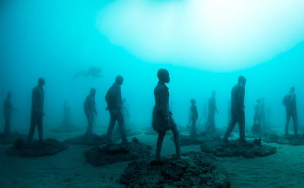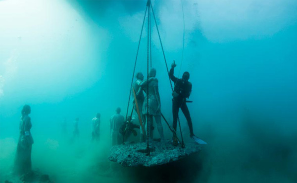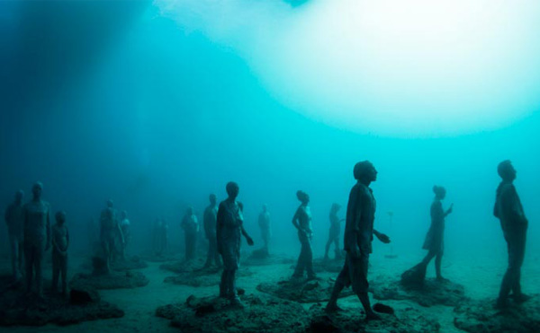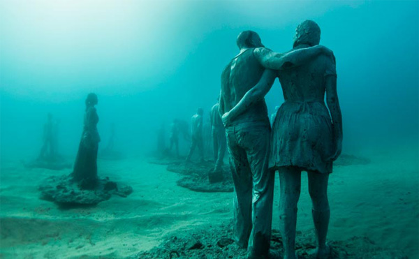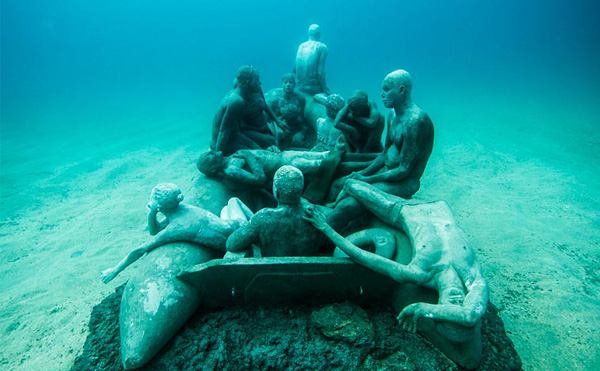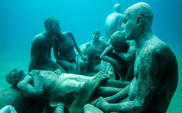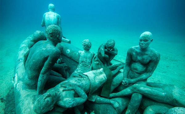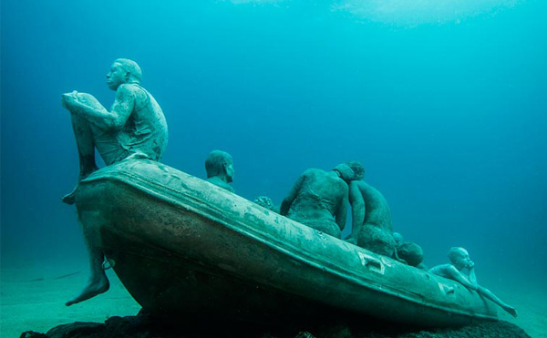 Sanatçı Jason deCaires Taylor daha önce Meksika ve Bahamalar’da deniz altında sergilediği heykellerini şimdi Kanarya Adaları’nın doğusunda, Lanzarote’nin kıyısında sergilemeye hazırlanıyor. Etkileyici ve ürpertici olan bu sualtı müzesi şimdilik The Raft of Lampedusa ve The Rubicon adında iki büyük koleksiyondan oluşuyor. Her ikisi de göçmen ve mülteciler için tasarlanmış. 15 metre derinliğindeki müzeye dalmanın yanı sıra şnorkellerle de ulaşmak mümkün. 25 Şubat‘ta açılacak olan müzede yer alan parçaların bir kısmına haberin üzerindeki galeriden bakabilirsiniz.