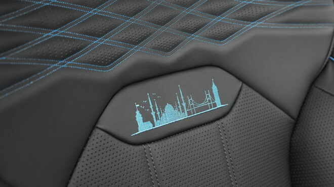 Renk teması, her bir aracın iç mekânında da devam ediyor. Örneğin Kız Kulesi, Galata Kulesi ve İstanbul Boğazı’nın üzerindeki ünlü köprüleri içeren “İstanbul Silüeti” Turkuaz Mavisi ile koltuk başlığına ve arka minderlere işleniyor. Tüm bu detaylar, ünlü Sultanahmet Camii’nin berrak mavi desenli çinilerinden esinlenerek lacivert ve siyah deriyle kaplanıyor.