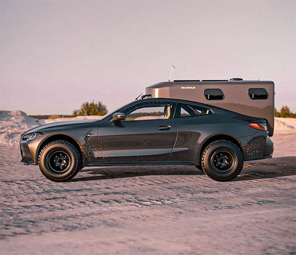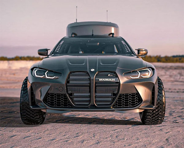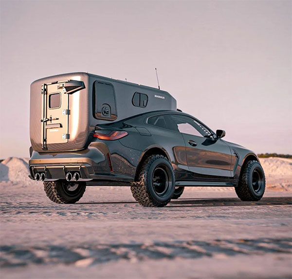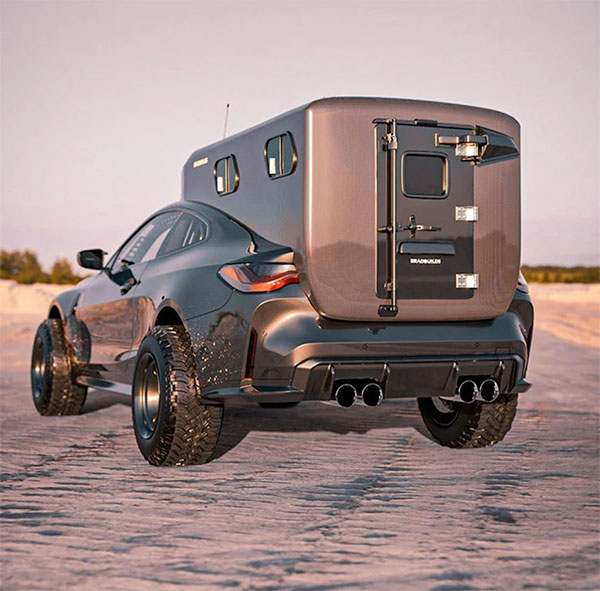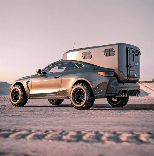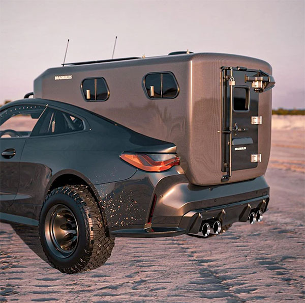 Konsept otomobil tasarımcısı Bradbuilds imzasını taşıyan sayfada gördüğünüz BMW M4, direkt olarak bir kamp aracı olarak hayal edilmiş. İlk bakışta arkasında taşıdığı “ev” dikkatleri üzerine çeken konsept araç, görebileceğiniz üzere devasa lastikler üzerinde oturuyor. M4’ün oldukça tartışmalı devasa böbreklerini koruyan ve buna rağmen özellikle önden inanılmaz etkileyici görünen model, birçok kişinin “keşke gerçek olsa” diyeceği konseptler arasına giriş yapıyor. 500 beygirlik tek yataklı bir kamp aracı olarak lanse edilen otomobil, yapısı gereği birçok zorlu arazide yol alabilecek bir seçenek konumunda bulunuyor. Yüksek arazi / yol performansı ile kamp eğlencesini bir araya getiren bu özel BMW M4, kendisine baktırmayı fazlasıyla biliyor.