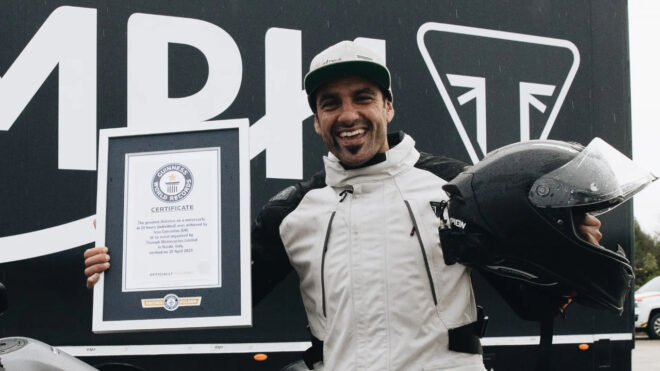 Iván Cervantes, Triumph Tiger 1200 GT Explorer motosiklet modeliyle 24 saat içinde tam 4.012 km yol yaptı ve Carl Reese tarafından 2017’de kırılan 3.406 km’lik eski rekoru geride bıraktı. Ortalama 167 km/s’lik sürüş ile 9 Temmuz tarihinde Guinness rekorlar kitabına giriş yapan Cervantes’in, beş kez Enduro Dünya Şampiyonu ve Triumph şirketinin küresel elçisi olduğu açıklandı. Yeni dünya rekoru İtalya’daki “Nardò Technical Centre” içerisinde bulunan yüksek hızlı sürüş alanında kırıldı. Rekor sırasında 12 km uzunluğundaki pistte toplam 317 tur atıldı. Bunun için 520 litre yakıt harcandı ve maksimumda 200 km/s hıza kadar ulaşıldı. 24 saatlik sürüşte 18 pit stop yapan Cervantes, fiziksel olarak oldukça zorlu bir denemenin altından başarıyla kalktı.