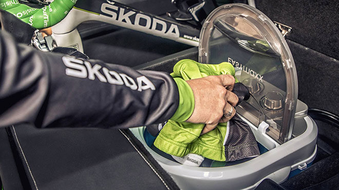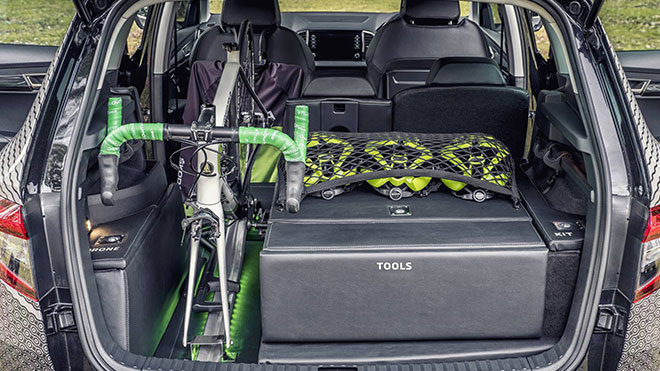 Skoda İngiltere tarafından geliştirilen konseptin çıkış noktasının düzenlenen bir anket olduğunu görüyoruz. Yapılan değerlendirmeler sonunda bisikleti hayatının önemli bir yerinde konumlandırmış kullanıcılar, araçların da buna kusursuz destek verebilecek donanımlarla bezenmesi görüşünce birleşmiş. Karşılığın verilmesi adına geliştirilen Karoq Velo’un dış bölümünde bu felsefeyi destekleyecek iki önemli nokta olduğunu söyleyebiliriz. Bunlardan ilki kolaylıkla fark edilen ve tavana entegre edilmiş taşıma paneli. İkincisi ise yaklaştıkça fark edilebilecek olan zincir desenli gövde çizgileri. Aracın en büyük karakteristik özellikleri ise bagaj kapağını açınca görebiliyoruz. Burada; tamir kiti için özel bir bölüm, drone için saklama alanı, bisiklet bölmesi, basınçı su desteği sunan yıkama alanı ve suluklar için soğutucu gibi gayet tatmin edici parçalar düşünülmüş. Satışa sunulmasıyla ilgili herhangi bir düşüncenin olmadığı Velo konsepti, bisiklet tutkunlarının kendi araçlarında yapabilecekleri dönüşüm için bir ilham kaynağı olabilir.