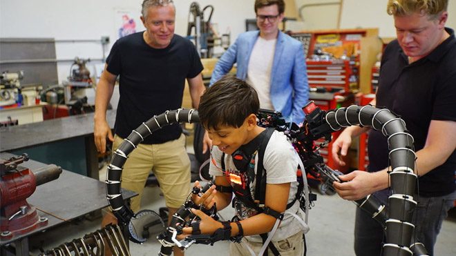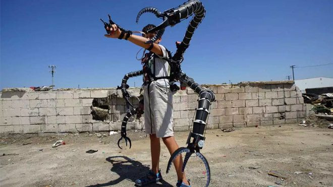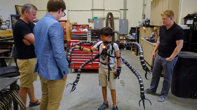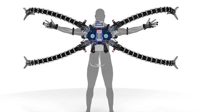 Spider-Man’in en bilindik, en popüler düşmanlarından biri Doctor Octopus. Karakterin en dikkat çekici özelliği ise elbette sırtından çıkan mekanik kolları. “Doctor Octopus’un zihniyle kontrol ettiği bu mekanik kollar gerçek hayata uyarlanabilir mi?” sorusunun cevabını ise bitcoin milyoneri Erik Finman veriyor. Finman’ın ürettiği ünite 3D yazıcı ile hazırlanmış. Kullanıcılar kolları mikrokontrolör ve 8 farklı motorla kontrol edebiliyor. Kollar sağa sola oynamanın yanı sıra bir şeyleri tutup kaldırabiliyor. Kullanıcılar için özel bir eldiven üreten ekip kontrol tuşlarını bu eldivene sabitliyor. Finman’ın yaptığı kostüm ise 10 yaşındaki Aristou Meehan için üretiliyor.